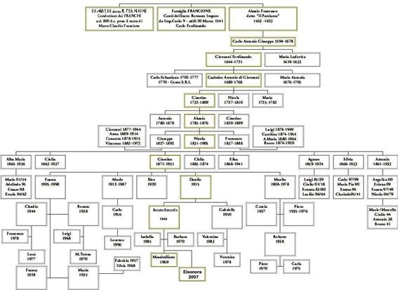 La famiglia FRANCIONE ebbe origine nell'anno 800 col capostipite Marco Claudio già Romualdo, capitano di ventura distintosi con i Franchi nella guerra contro i Longobardi che fin dal 568 avevano invaso l'Italia spezzandone l'unità politica creata da Roma al tempo di Cesare, fino alla caduta dell'Impero nel 476d.c., con la susseguente dominazione Gota, Ostrogota e Bizantina.